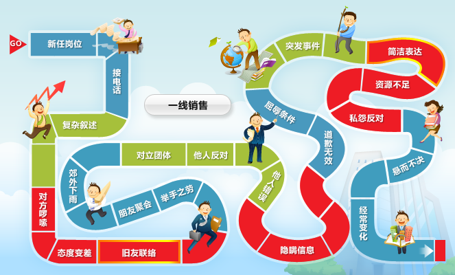 以下是一线销售人员的测评关键路径图(点击图中的闪亮处查看测评题示例):