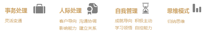 一线销售岗位胜任力测评考察与岗位优秀销售绩效高度相关的能力素质指标,由"事务处理"、"人际处理"、"自我管理"及"思维模式" 四个模块组成。